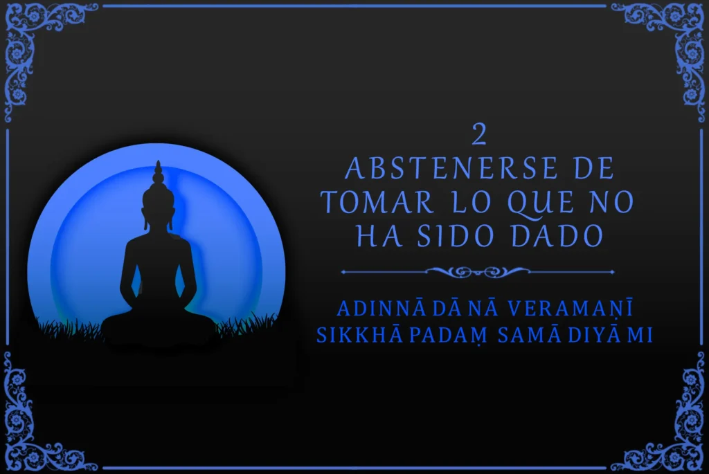 El segundo precepto dice: Adinnādānā veramaṇī sikkhāpadaṃ samādiyāmi, “Asumo el principio de práctica de abstenerse de tomar lo que no…