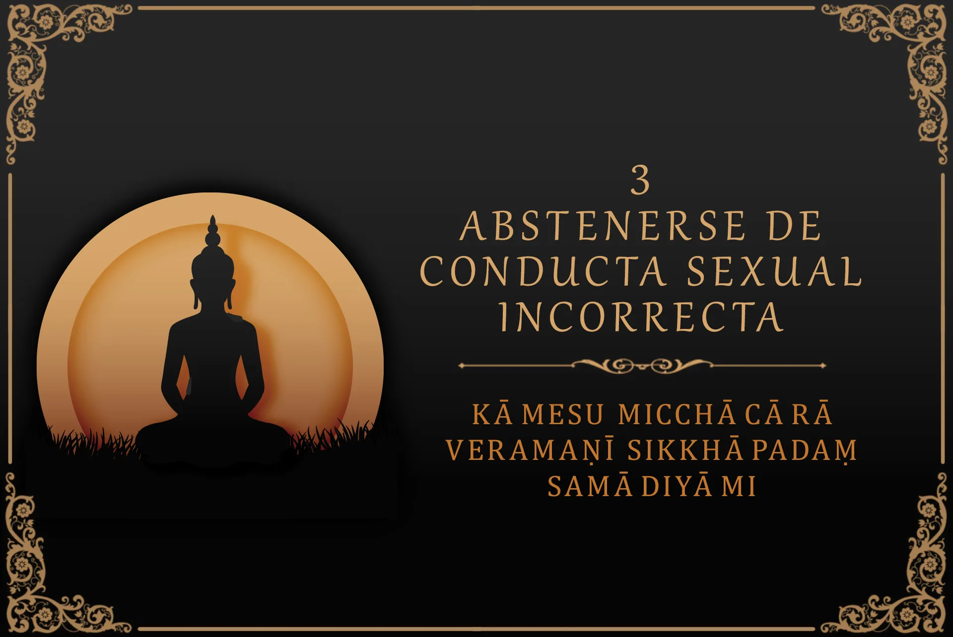 - Abstenerse de conducta sexual incorrecta (kāmesu micchācārā veramaṇī sikkhāpadaṃ samādiyāmi)