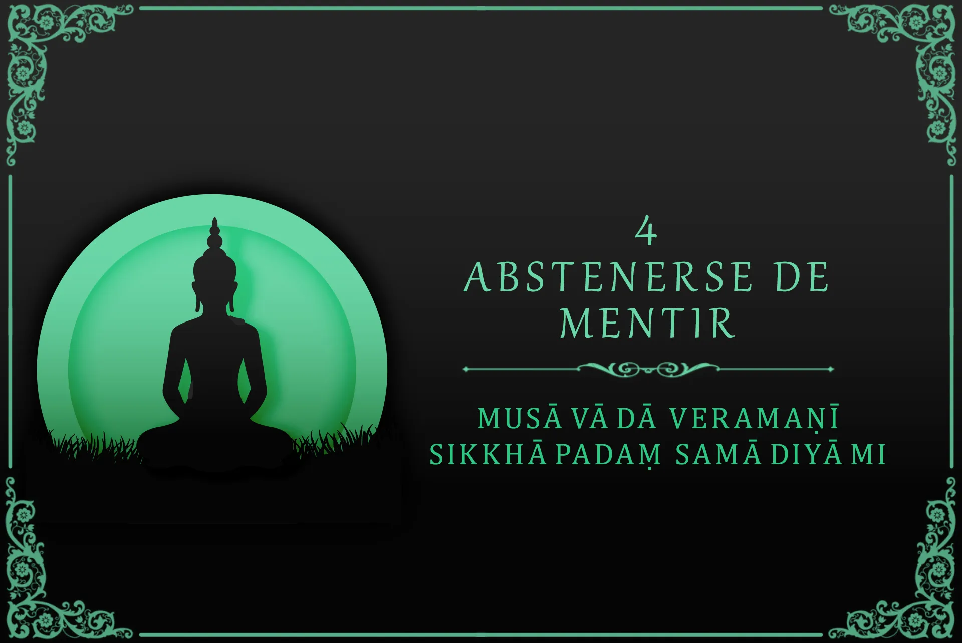 - Abstenerse de mentir (musāvādā veramaṇī sikkhāpadaṃ samādiyāmi)