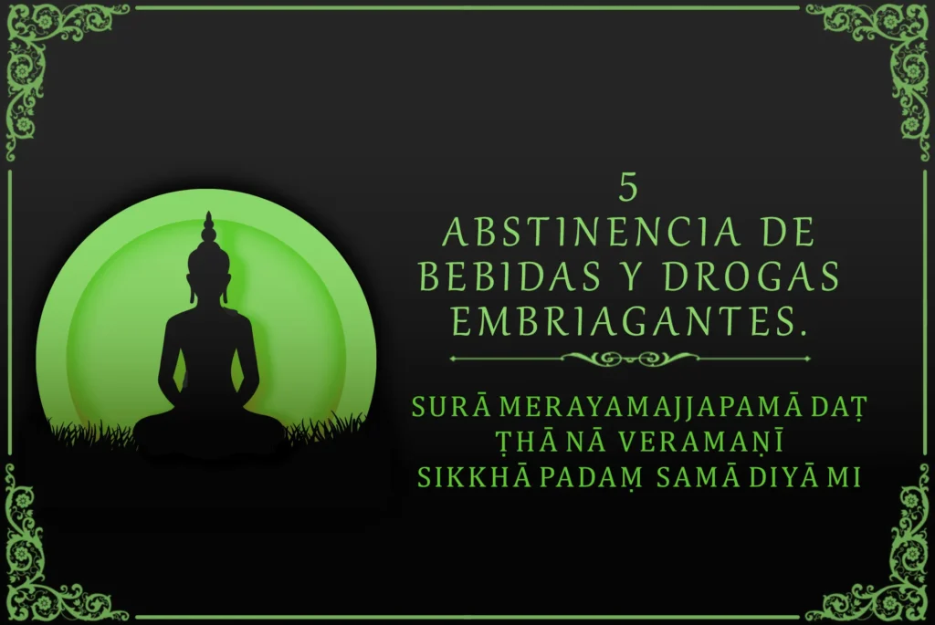 - Abstenerse de consumir sustancias intoxicantes que causan descuido (surāmerayamajjapamādaṭṭhānā veramaṇī sikkhāpadaṃ samādiyāmi)