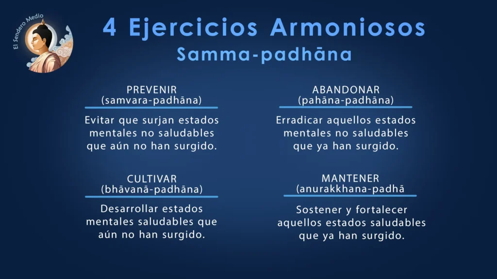 1. Prevenir (saṁvara-padhāna) Este esfuerzo implica evitar que surjan estados mentales no saludables que aún no han aparecido. Se trata de ser proactivo en la protección de la mente, de la misma manera que una fortaleza mantiene sus puertas cerradas para impedir la entrada de enemigos. Métodos de prevención Restricción de los sentidos (indriya-saṁvara): Evitar……
