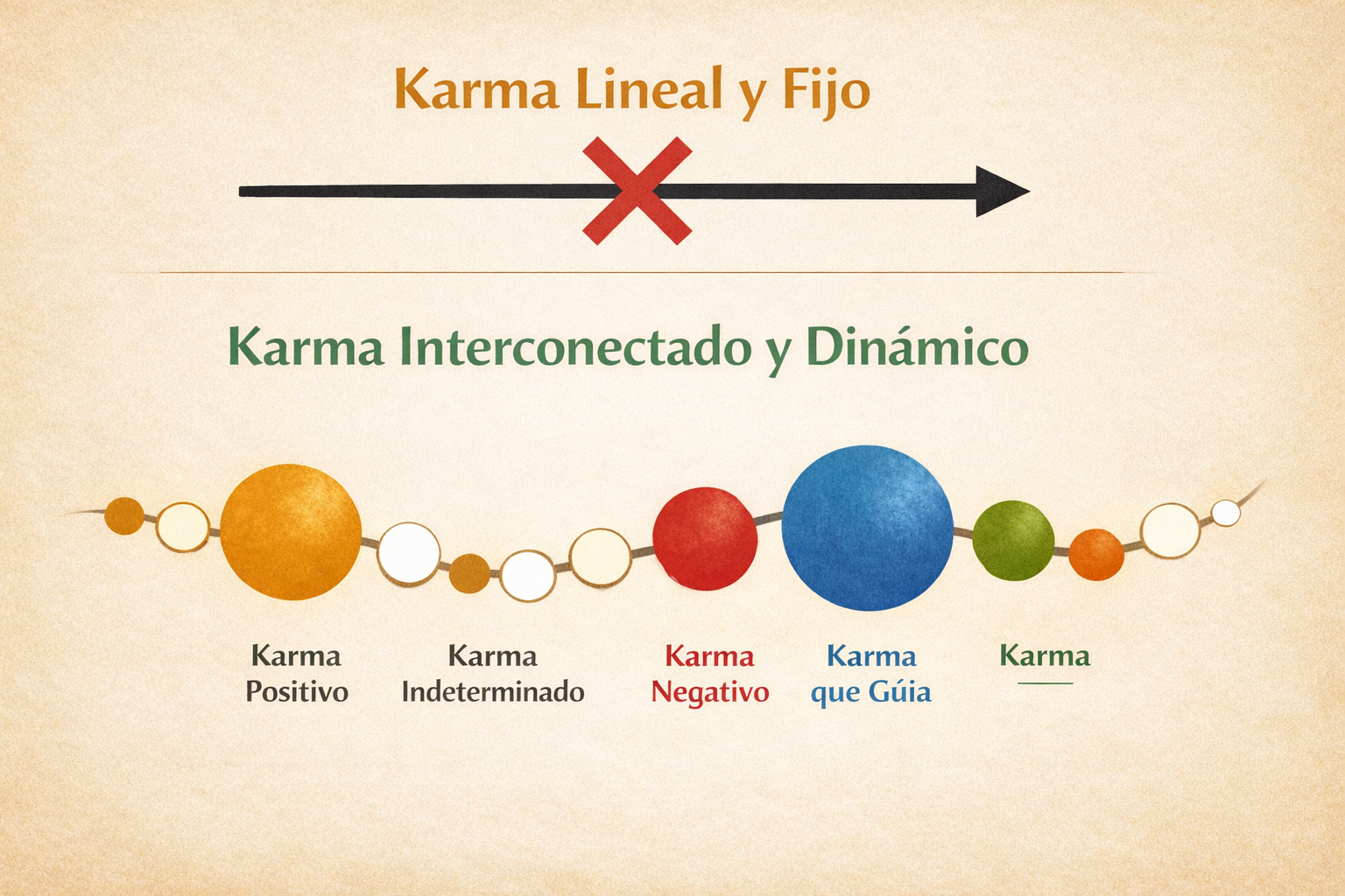 1. Modelo incorrecto: karma lineal La flecha representa la idea de que todo está predeterminado: “si algo malo ocurre, debía ocurrir”.Pero el Gautama Buddha rechazó esta visión fatalista. El karma no es una cadena rígida de eventos inevitables. 2. Modelo correcto: karma interconectado Cada círculo representa una acción intencional (kamma), como semillas plantadas en distintos……