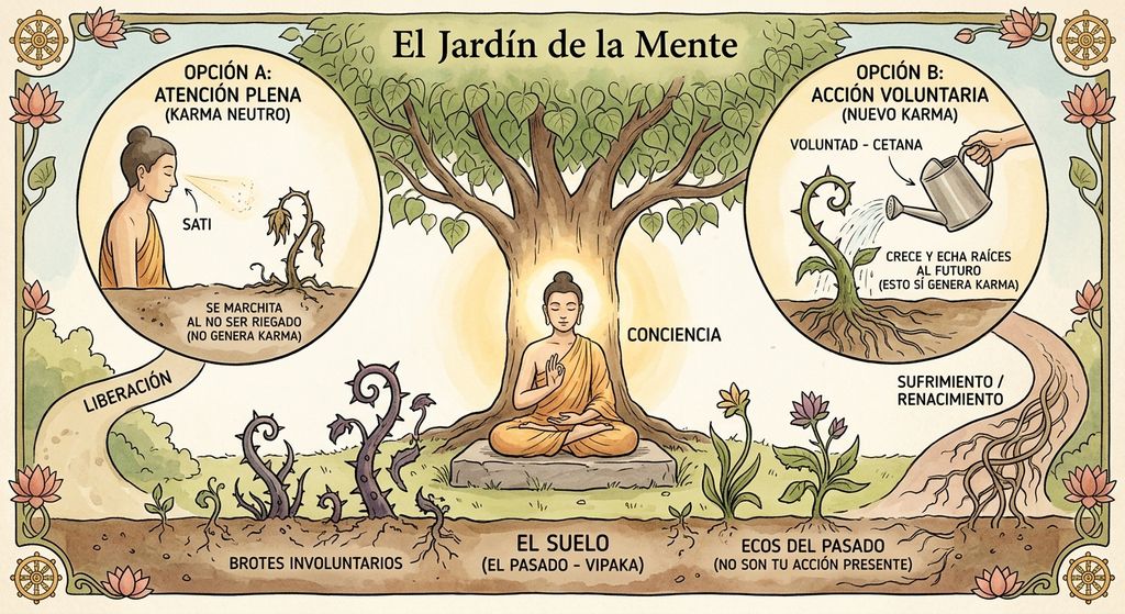 1. El mito de la «mente pura» A menudo se cree que practicar el camino budista implica no tener pensamientos negativos o intrusivos. Sin embargo, la mente funciona por condiciones. Es importante aclarar que no todo evento mental es una acción kármica. 2. La distinción clave: Recepción vs. Acción Para entender el karma, debemos diferenciar……