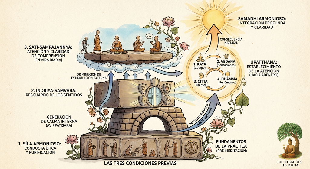 1. Sila Armonioso: La purificación del sustrato menta El Sila (conducta armoniosa) actúa sobre la agitación emocional. En la práctica: Cuando te sientas a meditar, la mente tiende a revisar las interacciones del día. Si ha habido deshonestidad, conflicto o acciones dañinas, surge el vippatisara (remordimiento o inquietud). Intervención directa: Un Sila sólido genera Avippatisara……