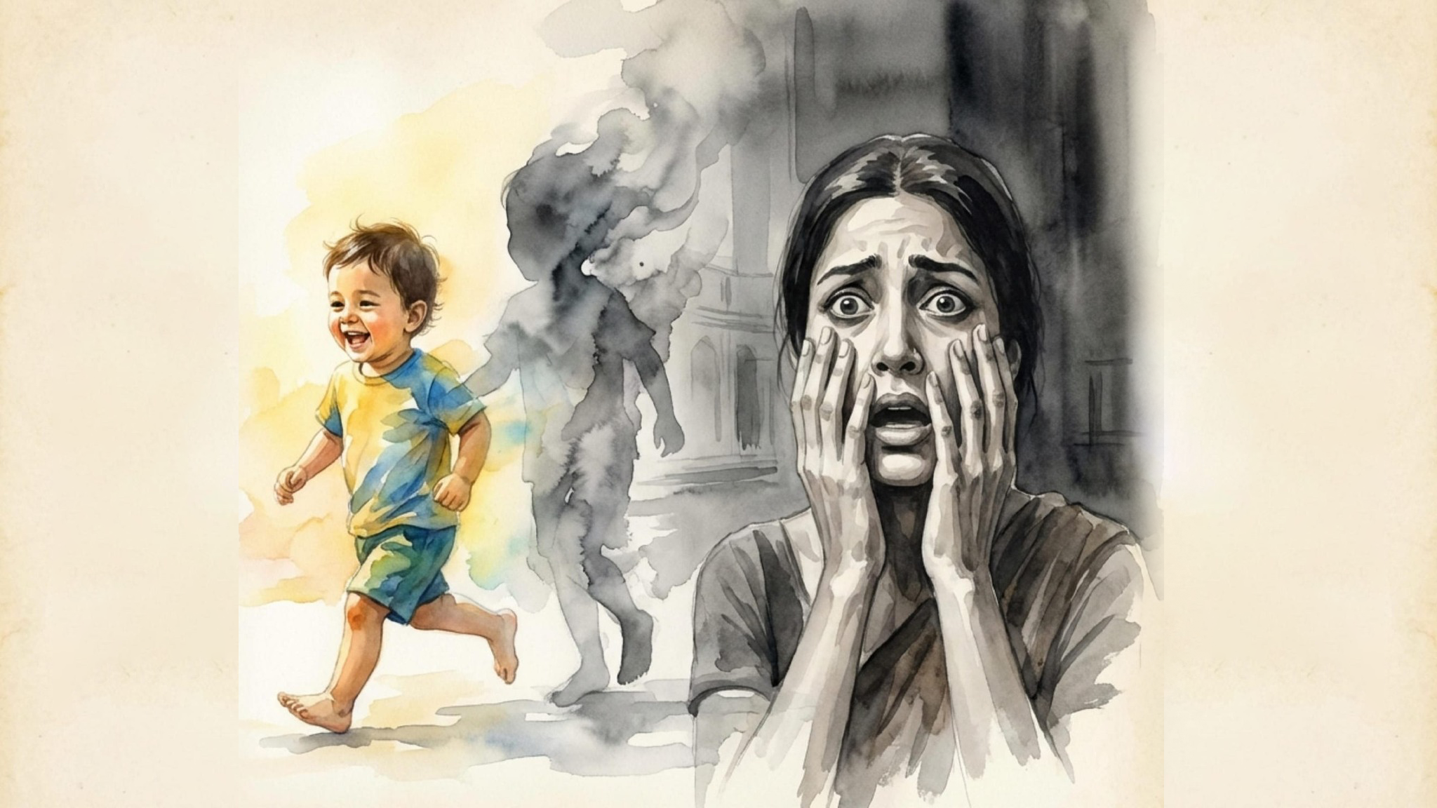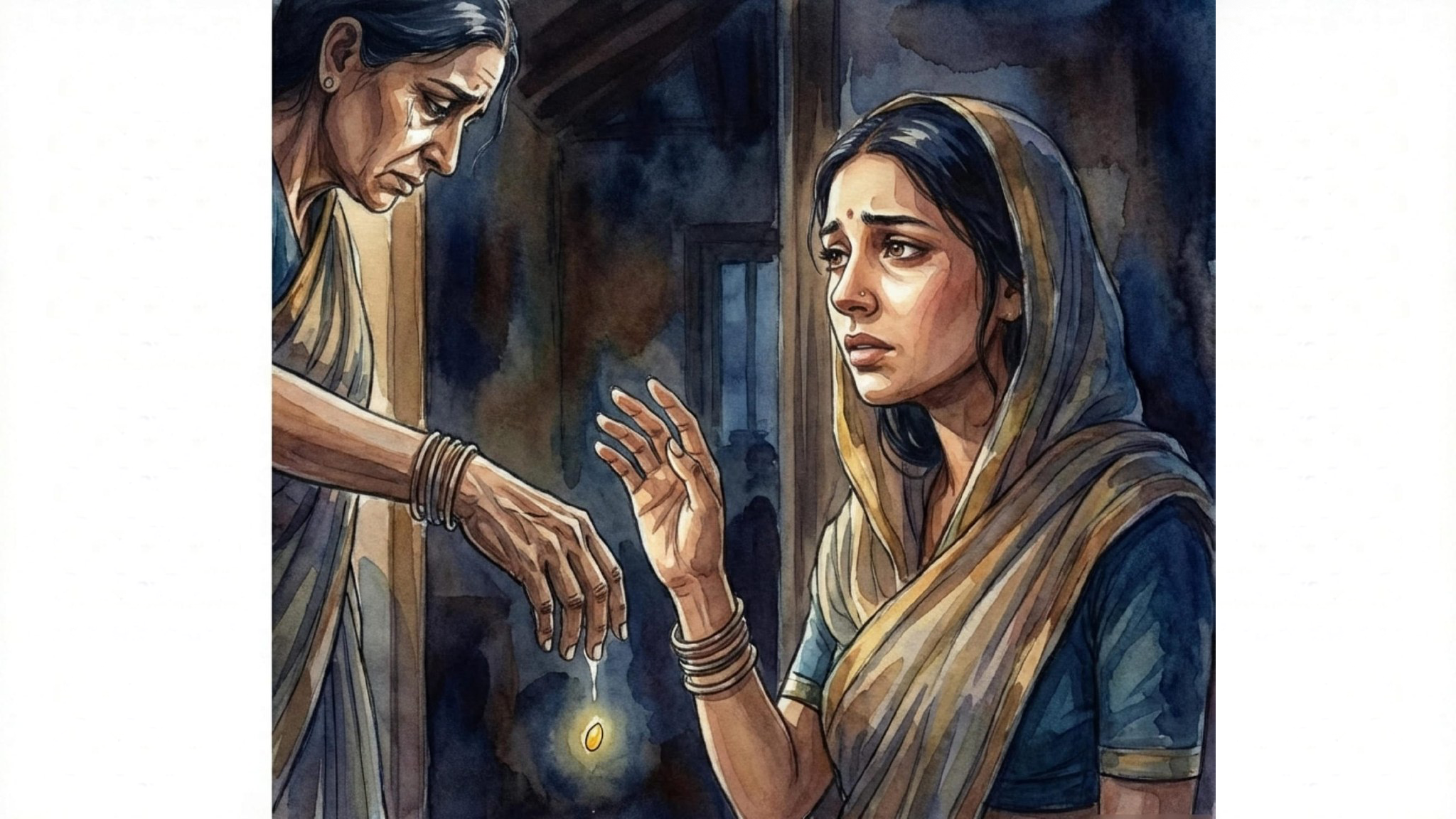 Pero en la edad del juego, mientras corría de aquí para allá, el niño murió. El dolor trastornó su mente. Temía que, sin su hijo, la familia le quitaría el respeto y se desharía del cuerpo.