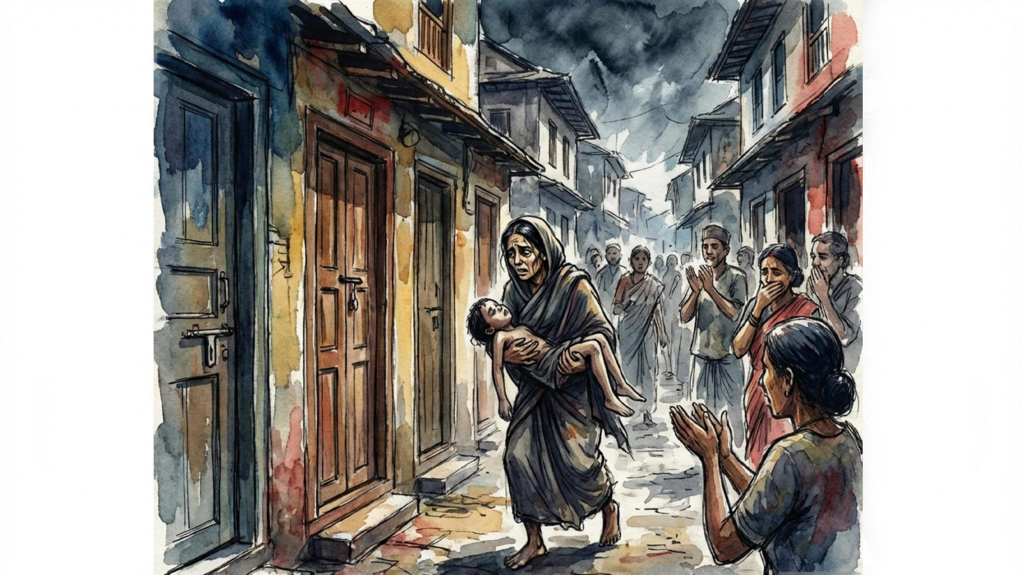 Negándose a aceptar la realidad, deambuló sucesivamente por varias casas preguntando: «Denme medicina para mi hijo».