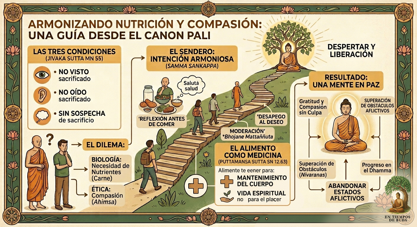 Para el Buda, el punto central de Sila (ética/moralidad) no es el alimento en sí, sino la participación en la intención de matar. En el Jivaka Sutta (MN 55), se establece que el consumo de carne es permisible bajo tres condiciones específicas: