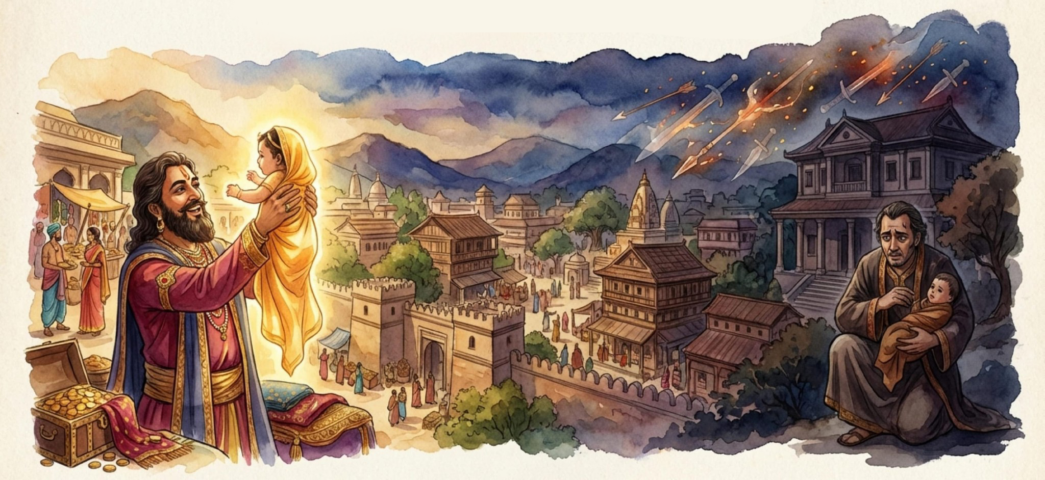 Simultáneamente, el capellán del Rey tuvo un hijo nacido bajo una «estrella de ladrones». Las armas resplandecieron por toda la ciudad al momento de su nacimiento. Su padre lo llamó Sattuka, «Pequeño Enemigo».