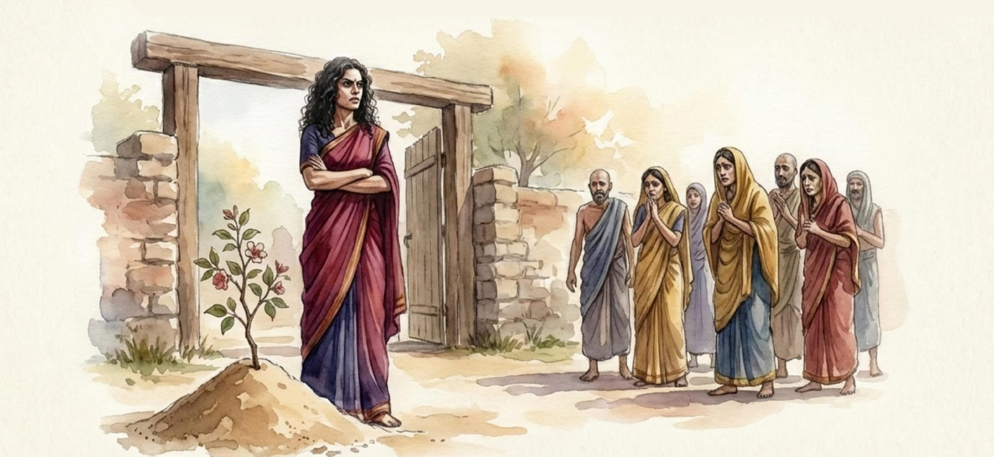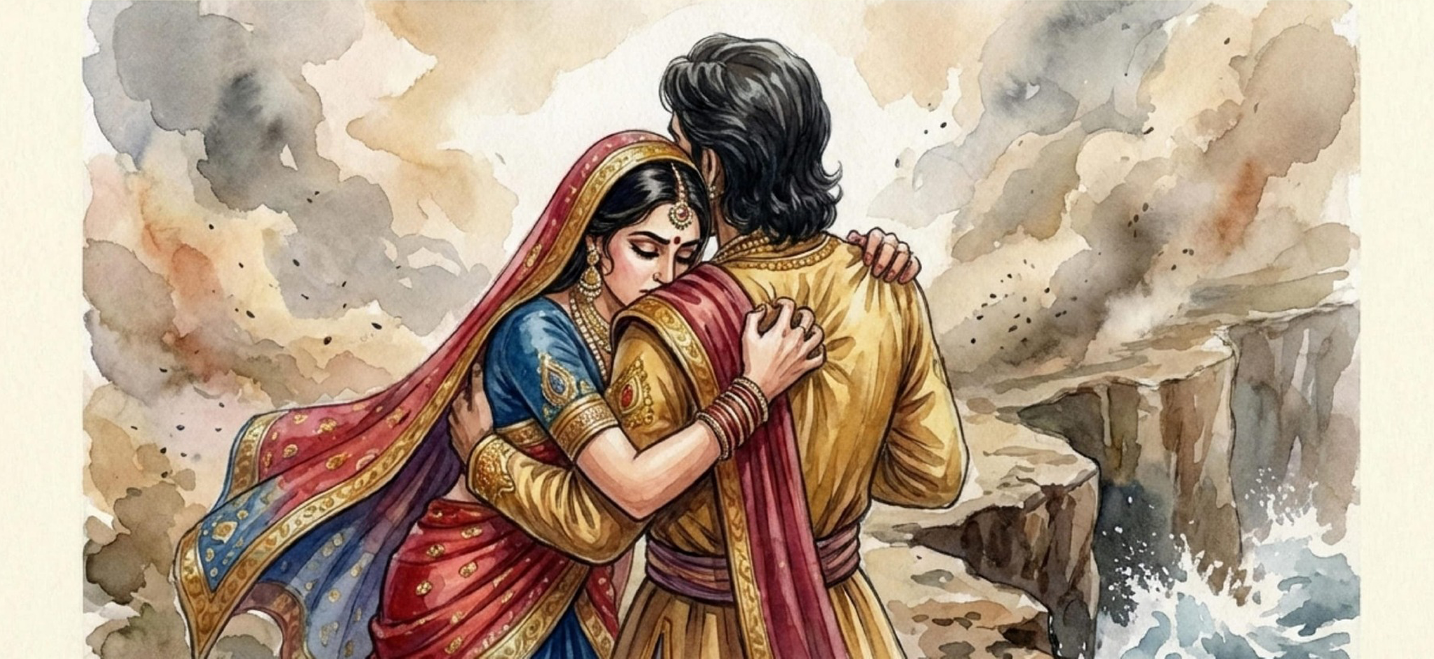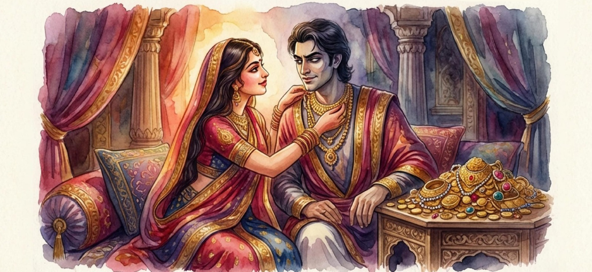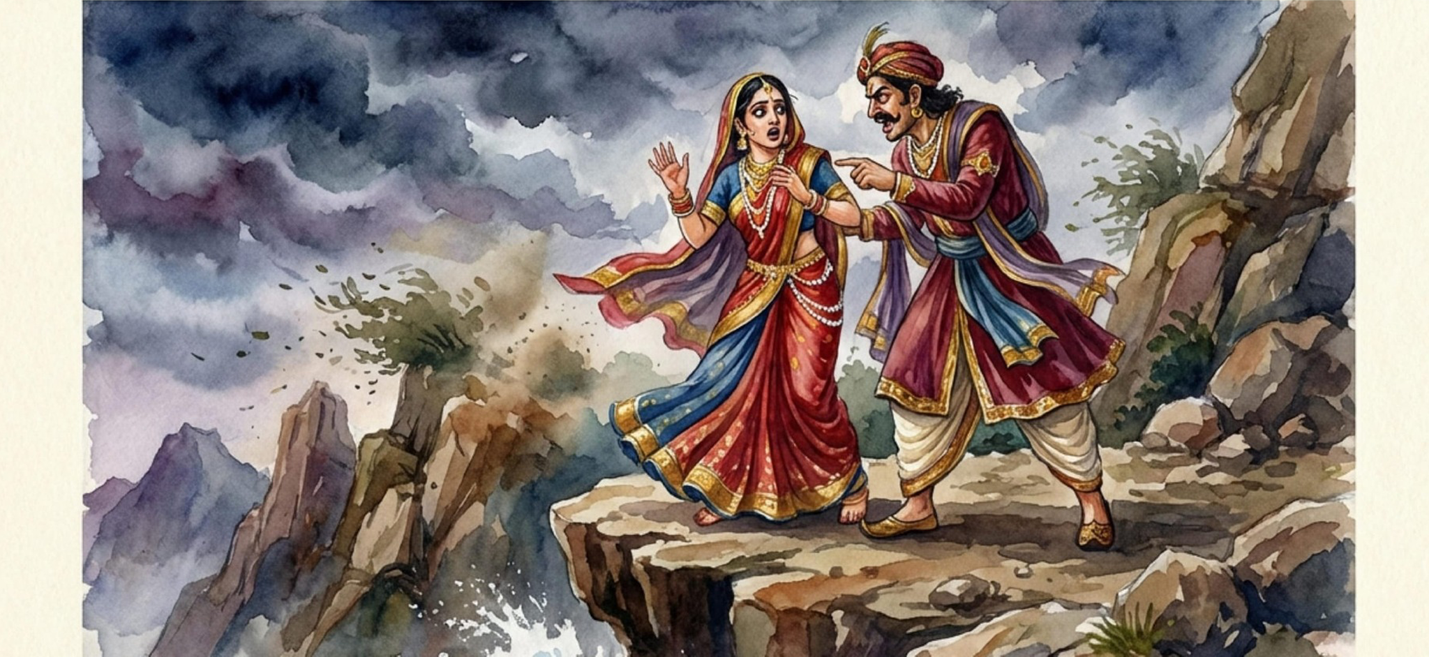 Pero un ladrón solo conoce el robo. Codiciando su inmensa riqueza, Sattuka ideó una trampa. «Prometí una ofrenda a una deidad de la montaña si mi vida era perdonada», mintió. «Prepara tus joyas, mi amor. Debemos subir al precipicio para pagar mi deuda».