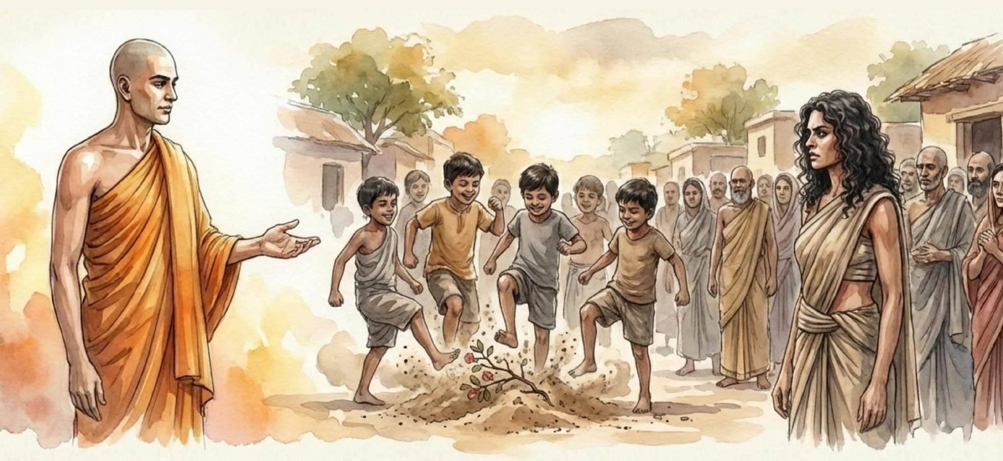 En cada ciudad, plantaba una rama de manzano en un montón de arena. «Quien pueda refutar mi doctrina», desafiaba, «que pisotee esta rama». Durante siete días en Sāvatthī, la rama permaneció intacta. La gente temía su lengua afilada.