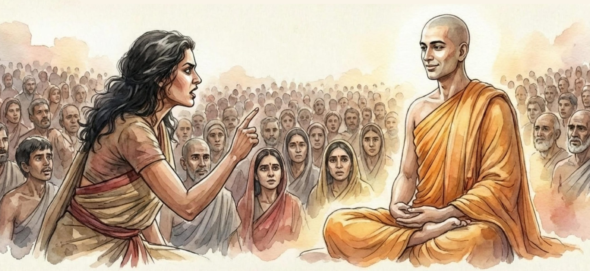 El Venerable Sāriputta, General del Dhamma, vio la rama. «Pisotéenla», les dijo a los niños del lugar. La trituraron hasta convertirla en polvo. Bhaddā regresó y encontró su desafío respondido. Confrontó a Sāriputta rodeada de una gran multitud. «Que haya una discusión», exigió. Sāriputta aceptó: «Pregunta según tu entendimiento».