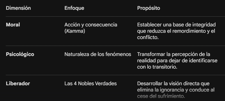 El Resultado: Produce mérito (punna). Crea las condiciones externas e internas óptimas para la práctica (salud mental, entorno seguro, honestidad).