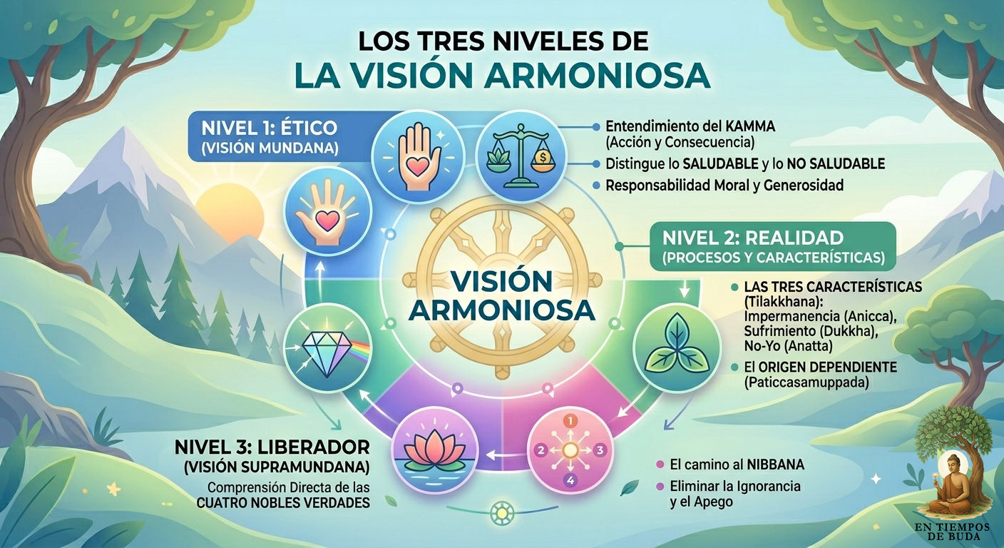 La Visión Armoniosa (Sammā-diṭṭhi) es la brújula del Óctuple Sendero. No se trata simplemente de una creencia intelectual, sino de una comprensión profunda de cómo funciona la realidad para dejar de chocar contra ella.