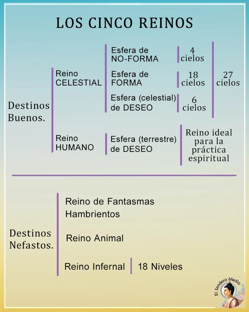 En las enseñanzas del Buddha, la existencia cíclica (saṃsāra) incluye múltiples planos de renacimiento. Estos no deben entenderse como lugares eternos o fijos, sino como estados condicionados que surgen por la fuerza del kamma, sin que exista un yo o una conciencia sustancial que transmigre. Cada renacimiento es el resultado de condiciones específicas, como se explica en la doctrina del origen dependiente (paṭiccasamuppāda).